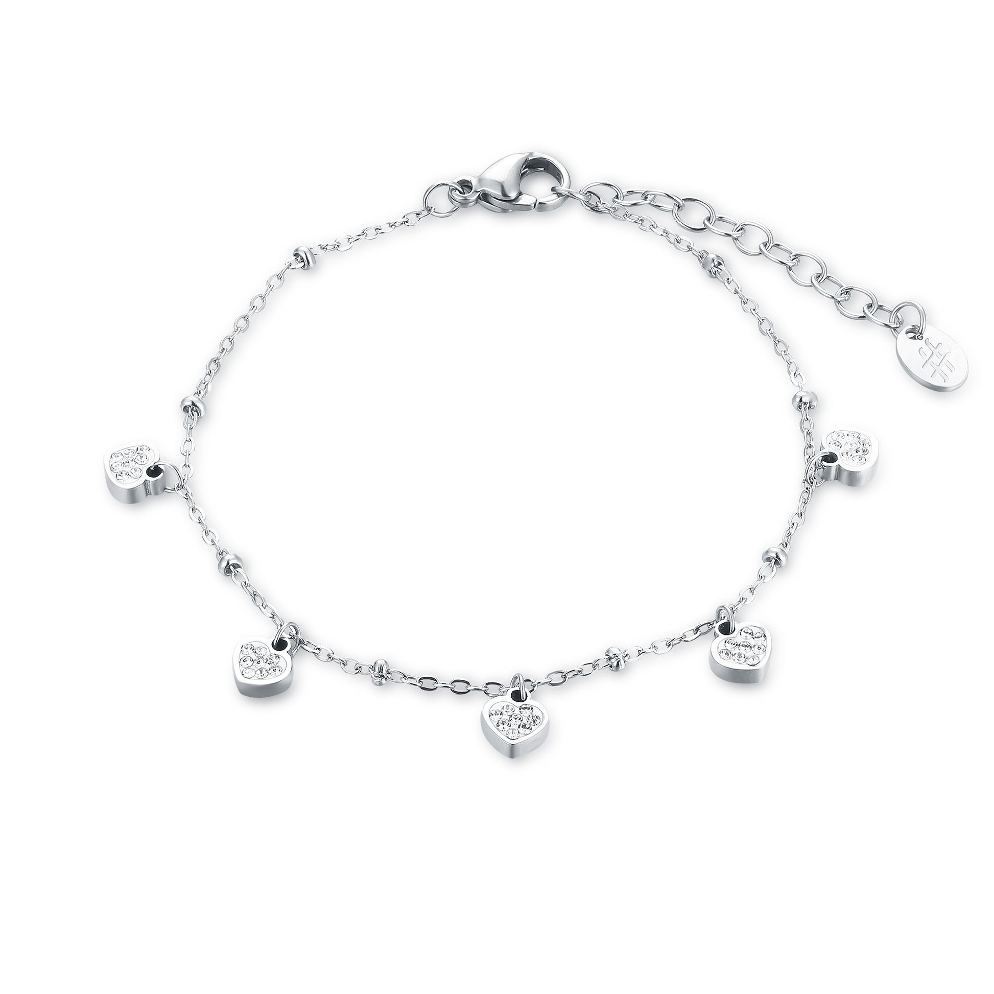 Bracciale con 5 cuori pendenti di dimensioni 5mm e catena con pallini da 2mm.