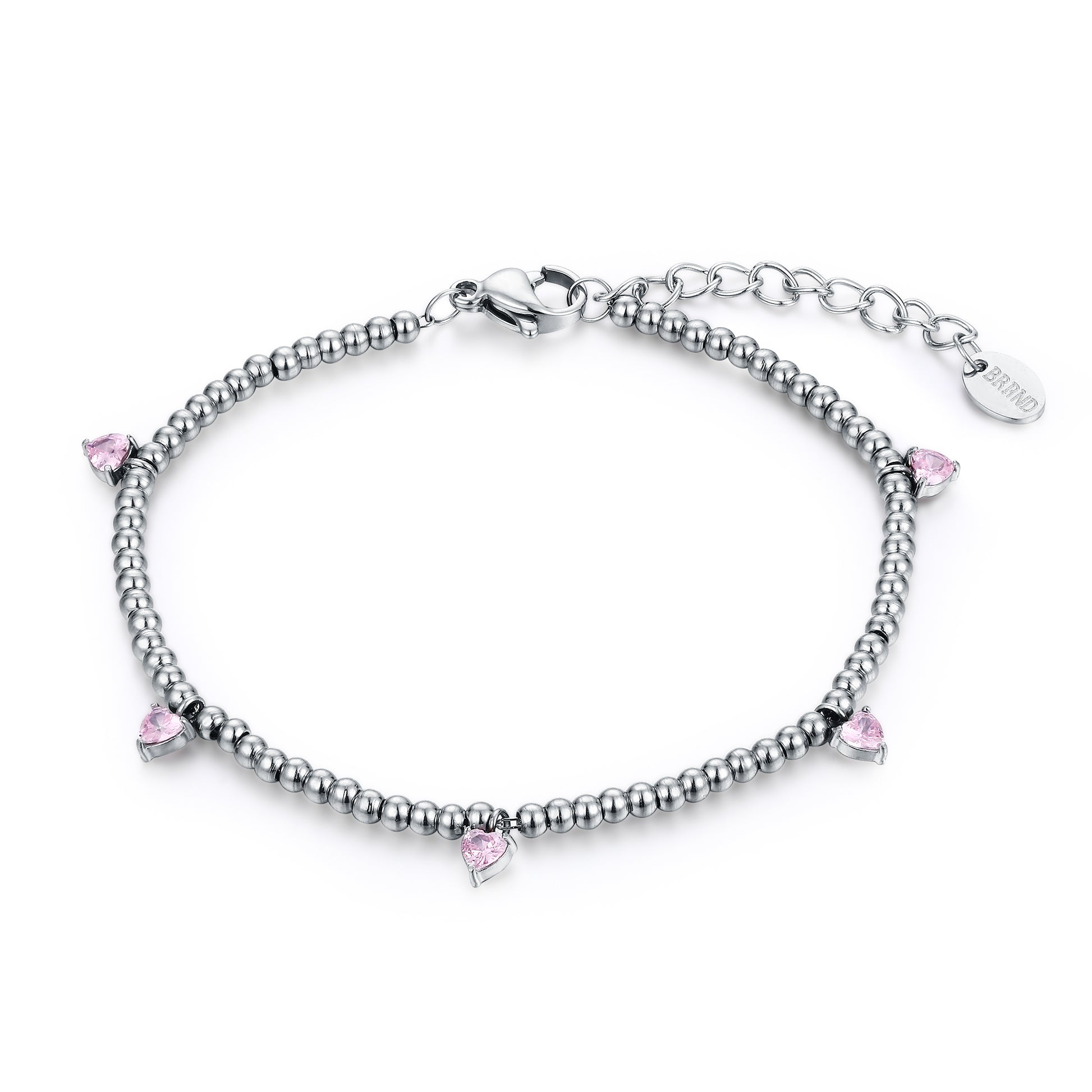 Bracciale a sfere con cinque cristalli a cuore pendenti rosa