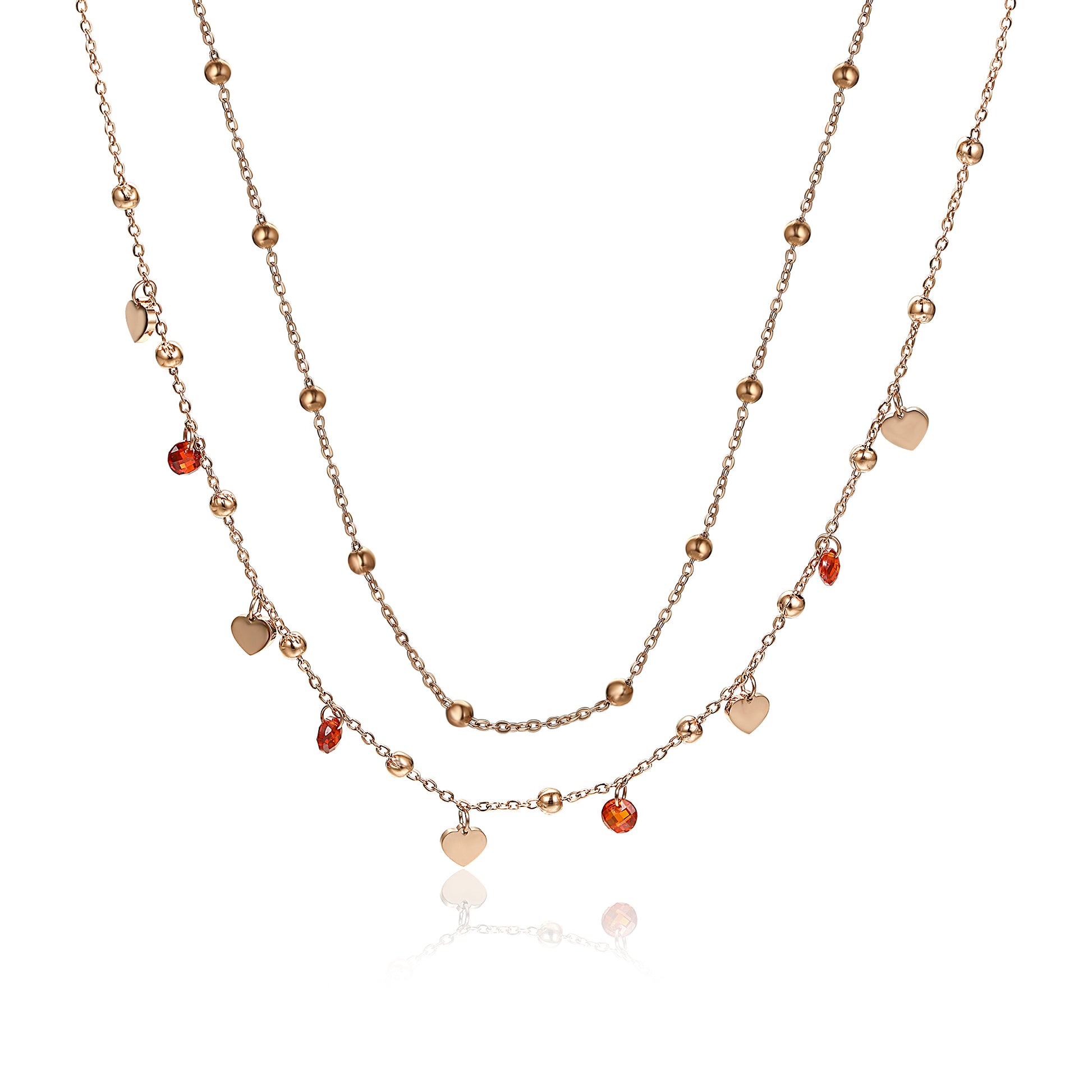Collana Doppia Cuori Rosè e Cristalli Rossi