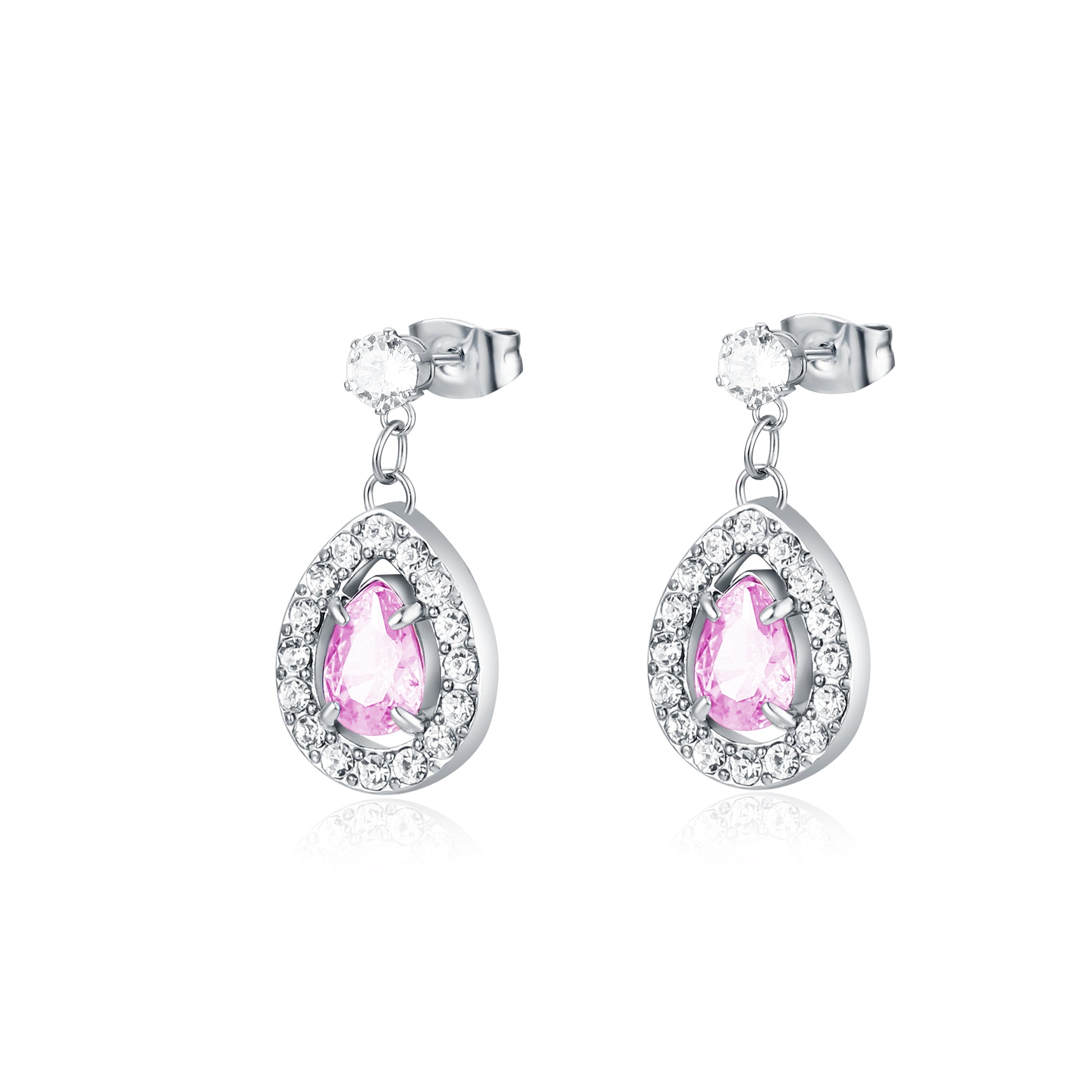Orecchini punto luce bianco con cristallo goccia rosa pendente