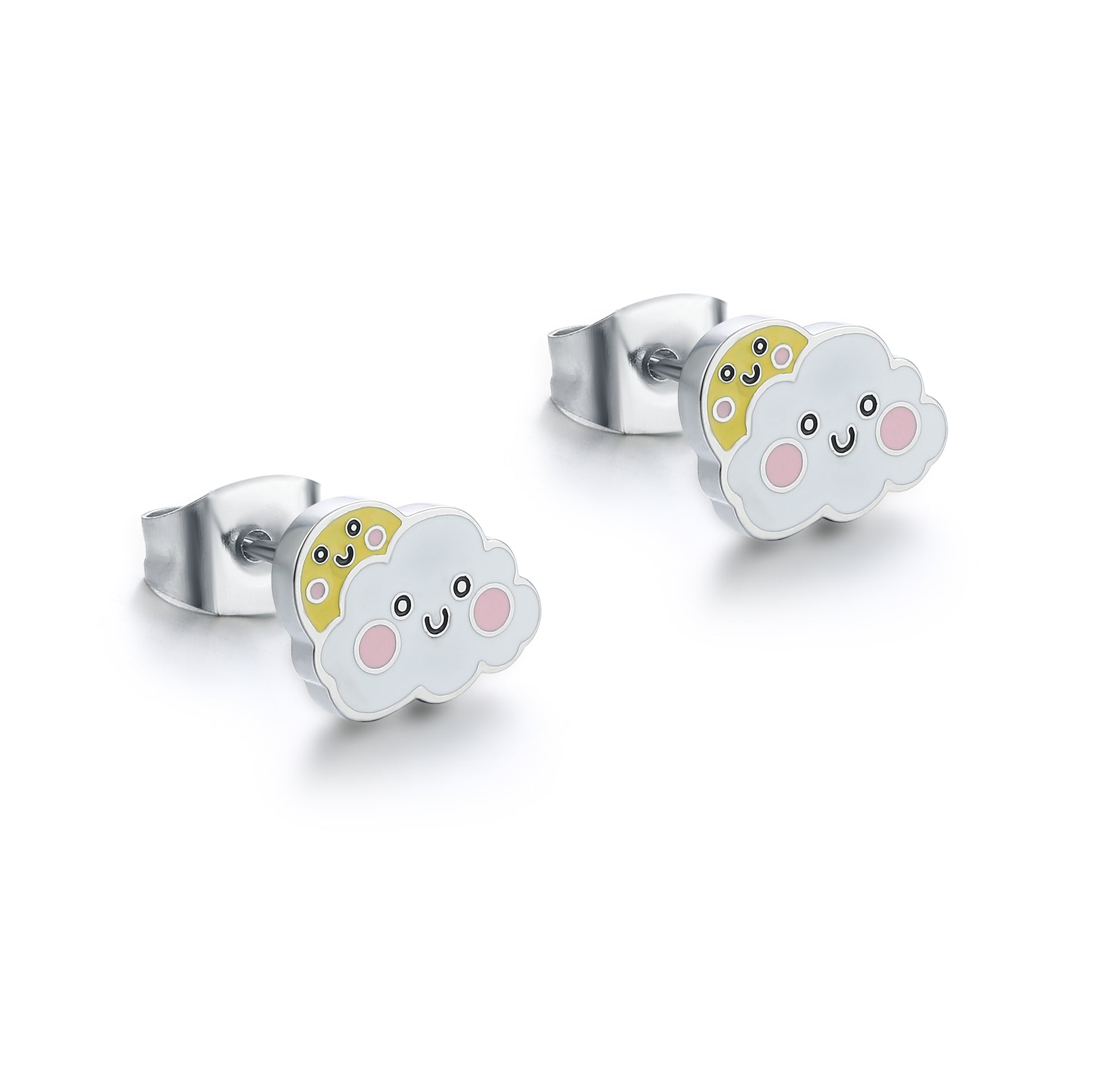 Coppia di orecchini lobo con sole e nuvola smaltata dimensione 8 mm x 6 mm.