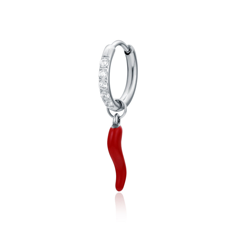L’orecchino a scattino con cristallini bianchi e pendente a cornetto smaltato rosso portafortuna #BrandGioielli è pensato per chi desidera portare sempre con sé un simbolo di buona fortuna senza rinunciare a stile e femminilità. Viene venduto singolamente ed è disponibile nelle finiture oro e acciaio, è il regalo perfetto per chi cerca un tocco colorato e di carattere per il proprio stile